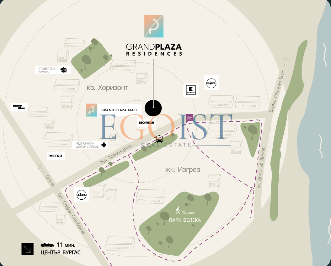 Комплекс расположен в квартале Горизонт - одном из наиболее развивающихся районов Бургаса - и имеет прямую «тёплую связь» с Grand Plaza Mall. Рядом - школы и детские сады, медицинские услуги, городская инфраструктура и будущий студенческий кампус; для прогулок и отдыха - зелёные зоны, включая Парк Веле́ка и район Минерални бани.