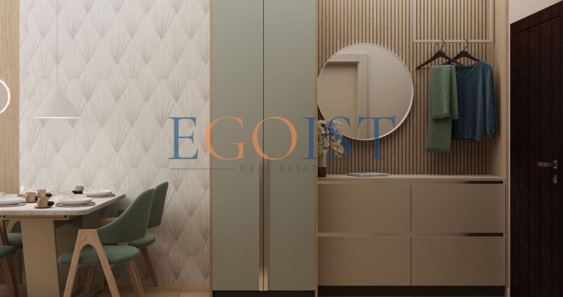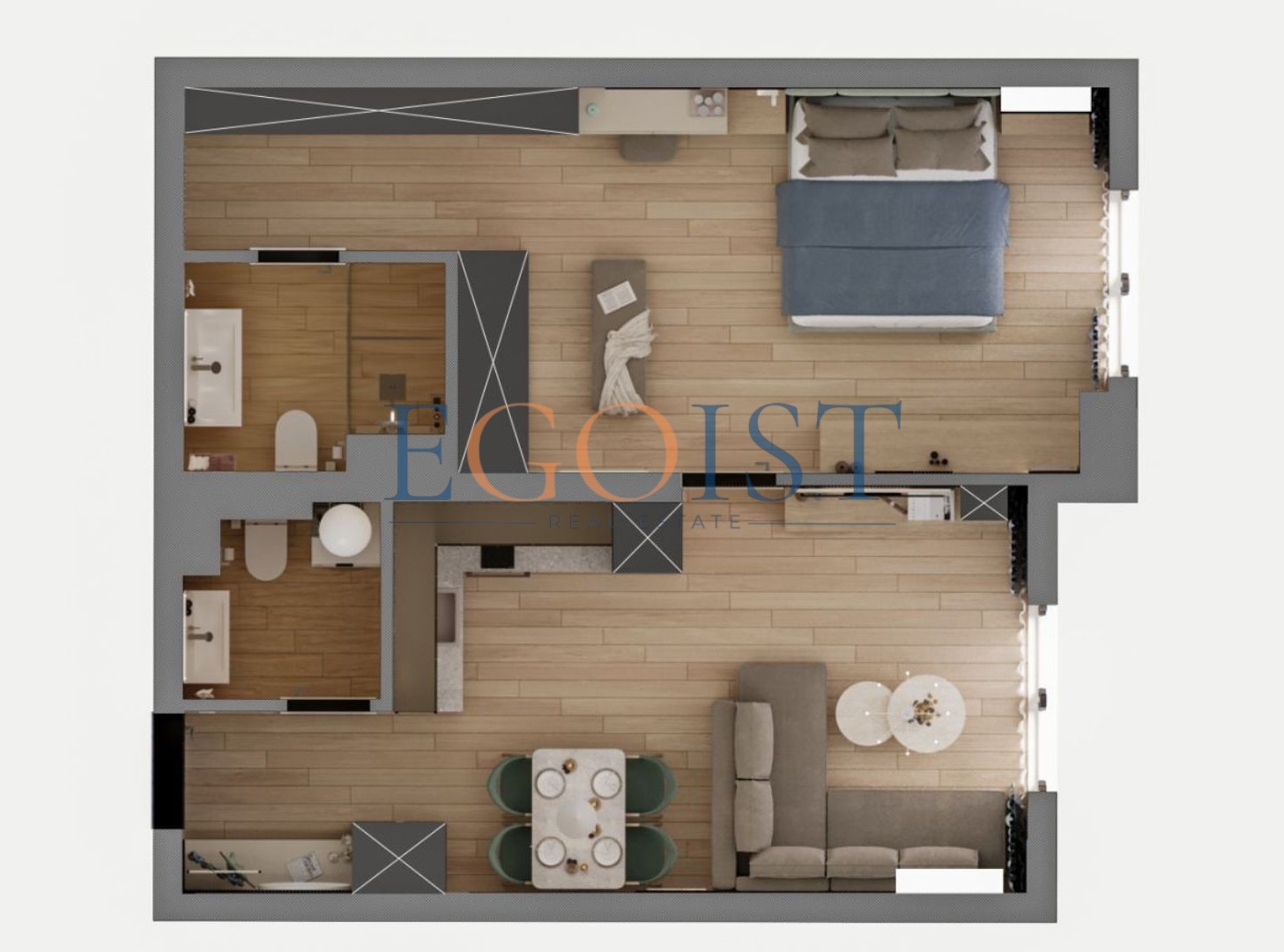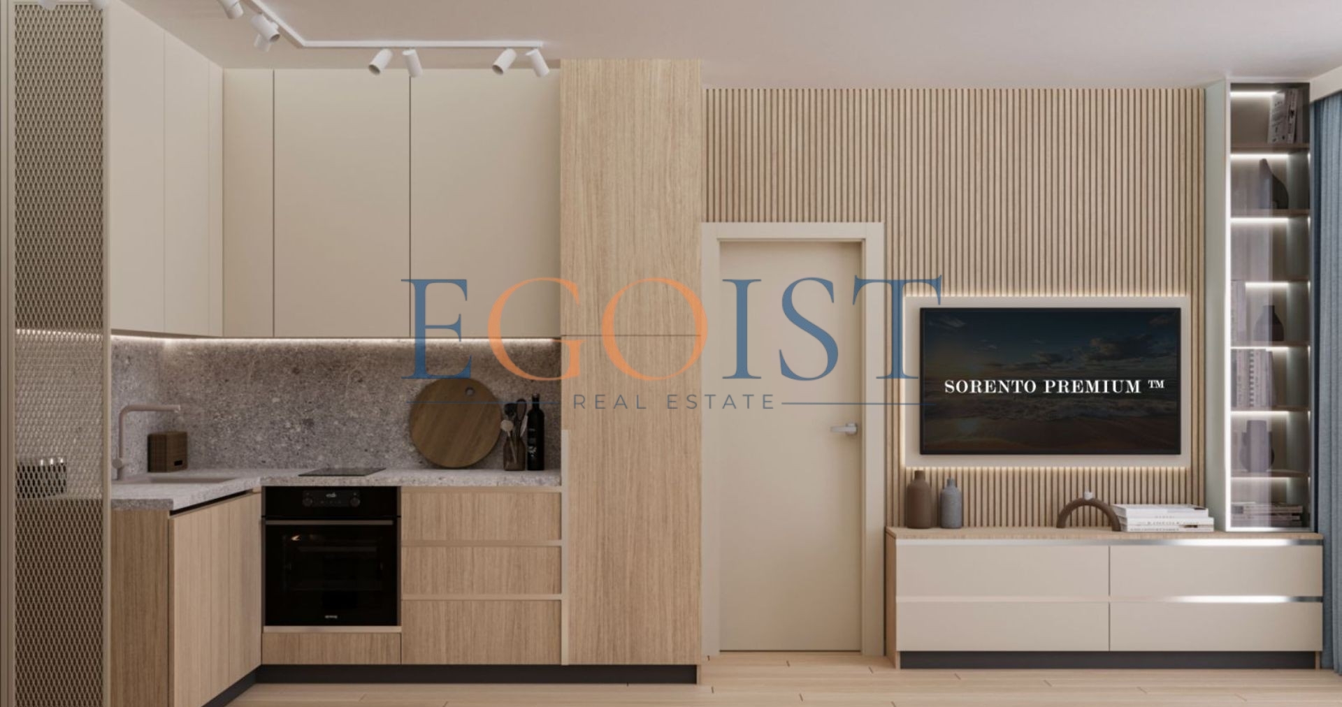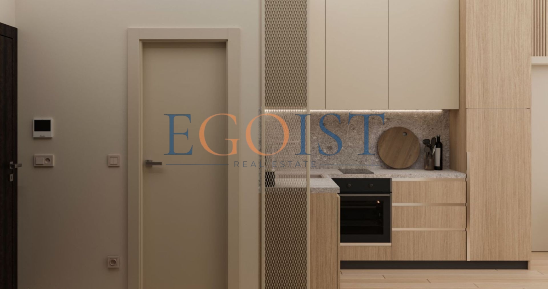 Студия состоит из прихожей, комнаты с кухонной зоной и зоной для отдыха, санузла и террасы. Студии продаются в стадии „под ключ“.