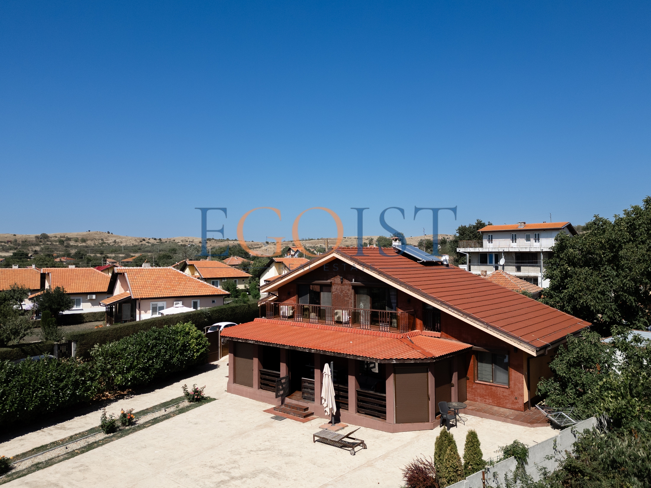 The total area of the house is 163 square meters, and the plot is approximately 900 square meters. The house is fully furnished, equipped with modern appliances, and ready for occupancy. A heating system with a boiler and a thermal pump ensures year-round comfort.
