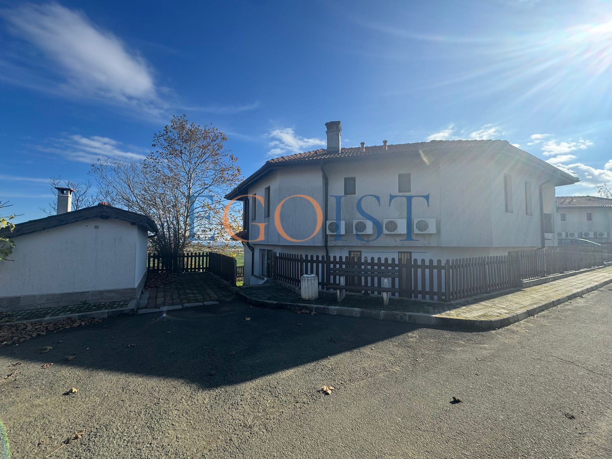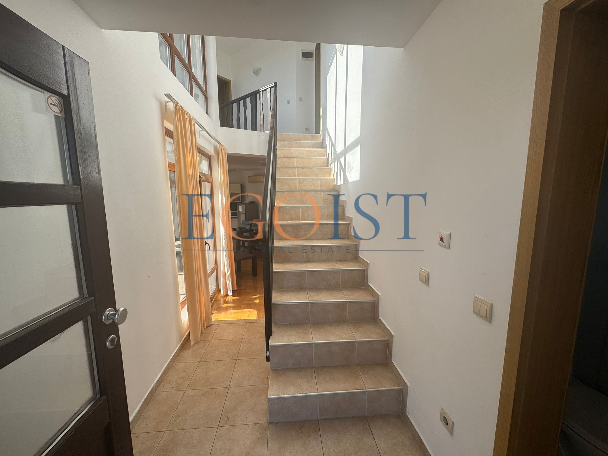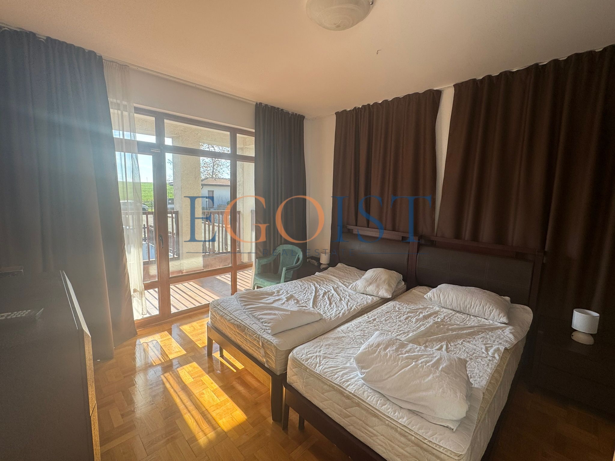 This two-story, three-bedroom house is for sale in the Floral Hills complex, located in the Kableshkovo area of Burgas Province. The house consists of an entrance hall, a spacious living room with a kitchen and access to a terrace and private garden, three bedrooms (one on the ground floor), three bathrooms, and a balcony overlooking the sea and the complex grounds.