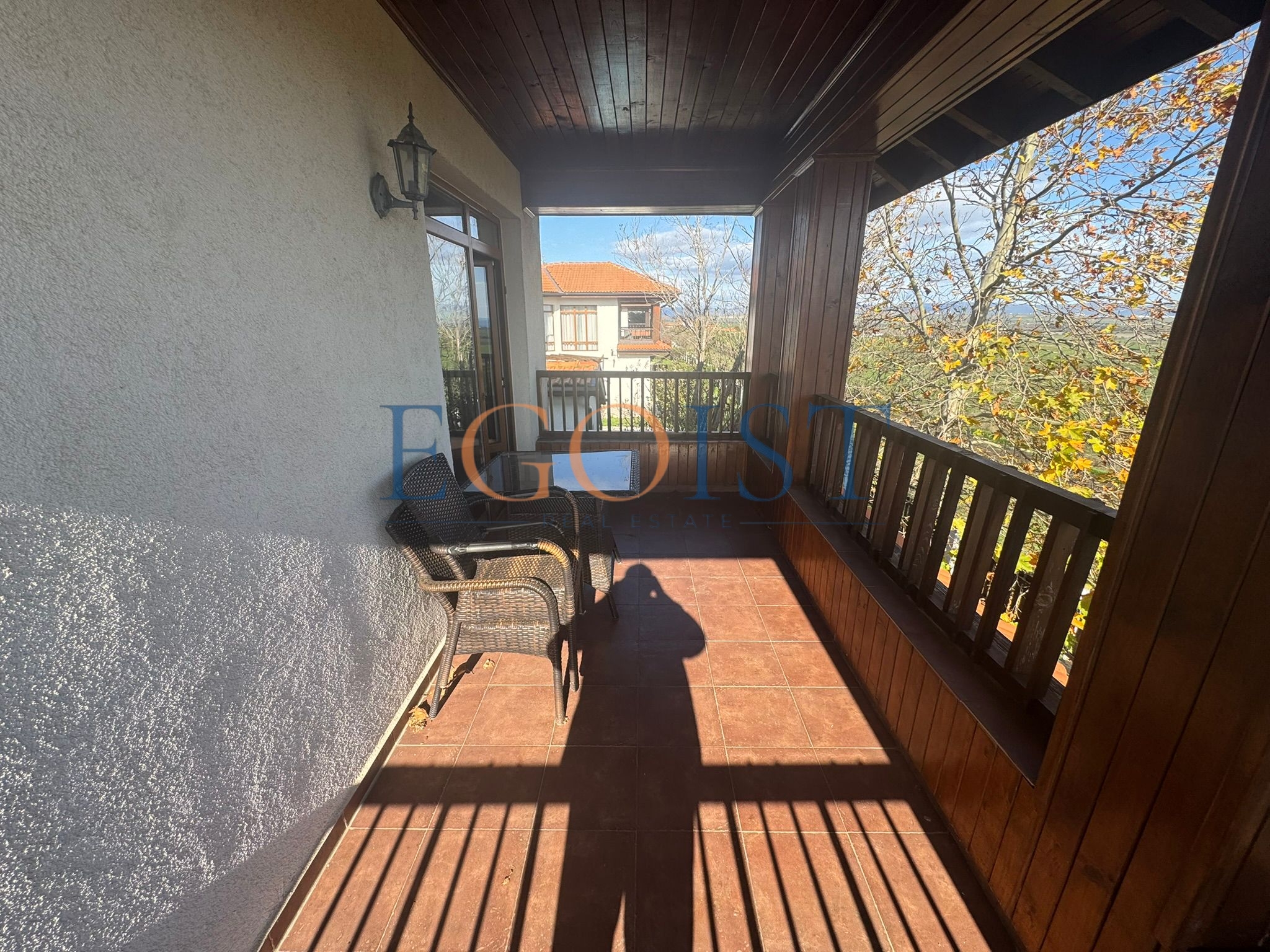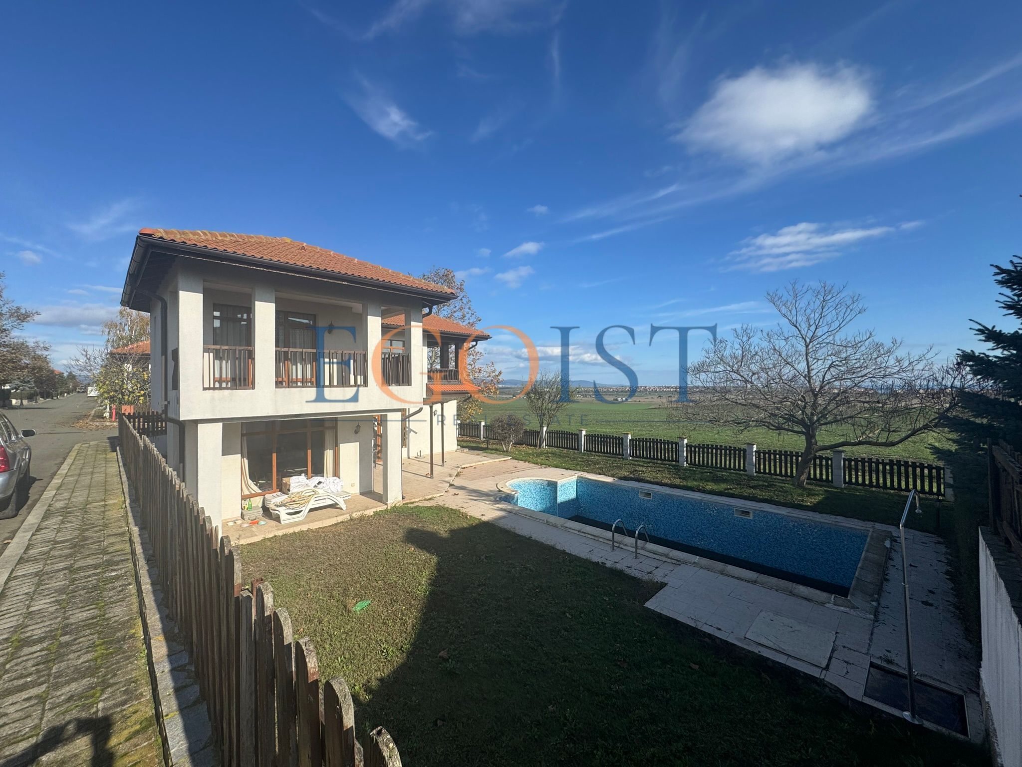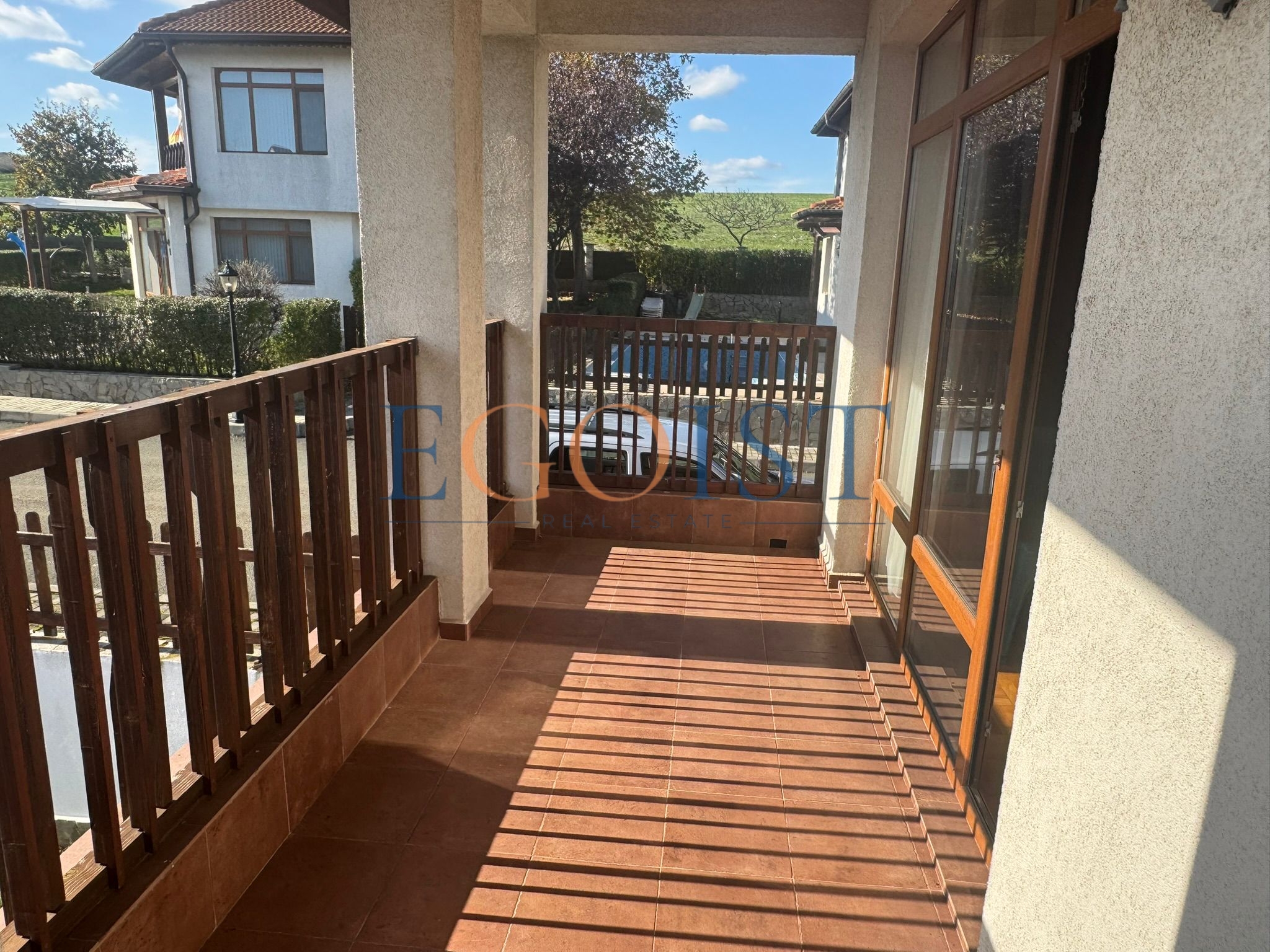 This two-story, three-bedroom house is for sale in the Floral Hills complex, located in the Kableshkovo area of Burgas Province. The house consists of an entrance hall, a spacious living room with a kitchen and access to a terrace and private garden, three bedrooms (one on the ground floor), three bathrooms, and a balcony overlooking the sea and the complex grounds.