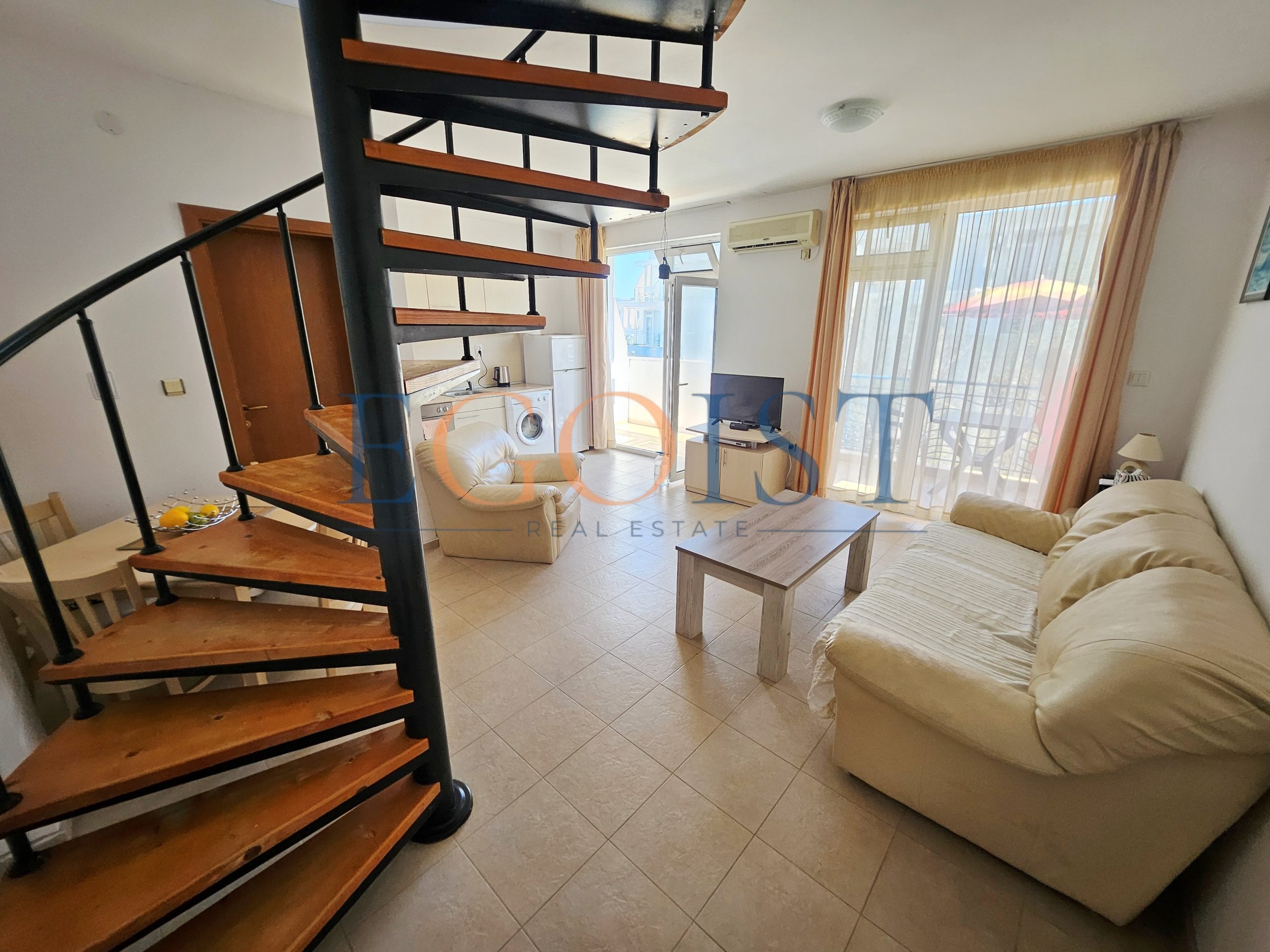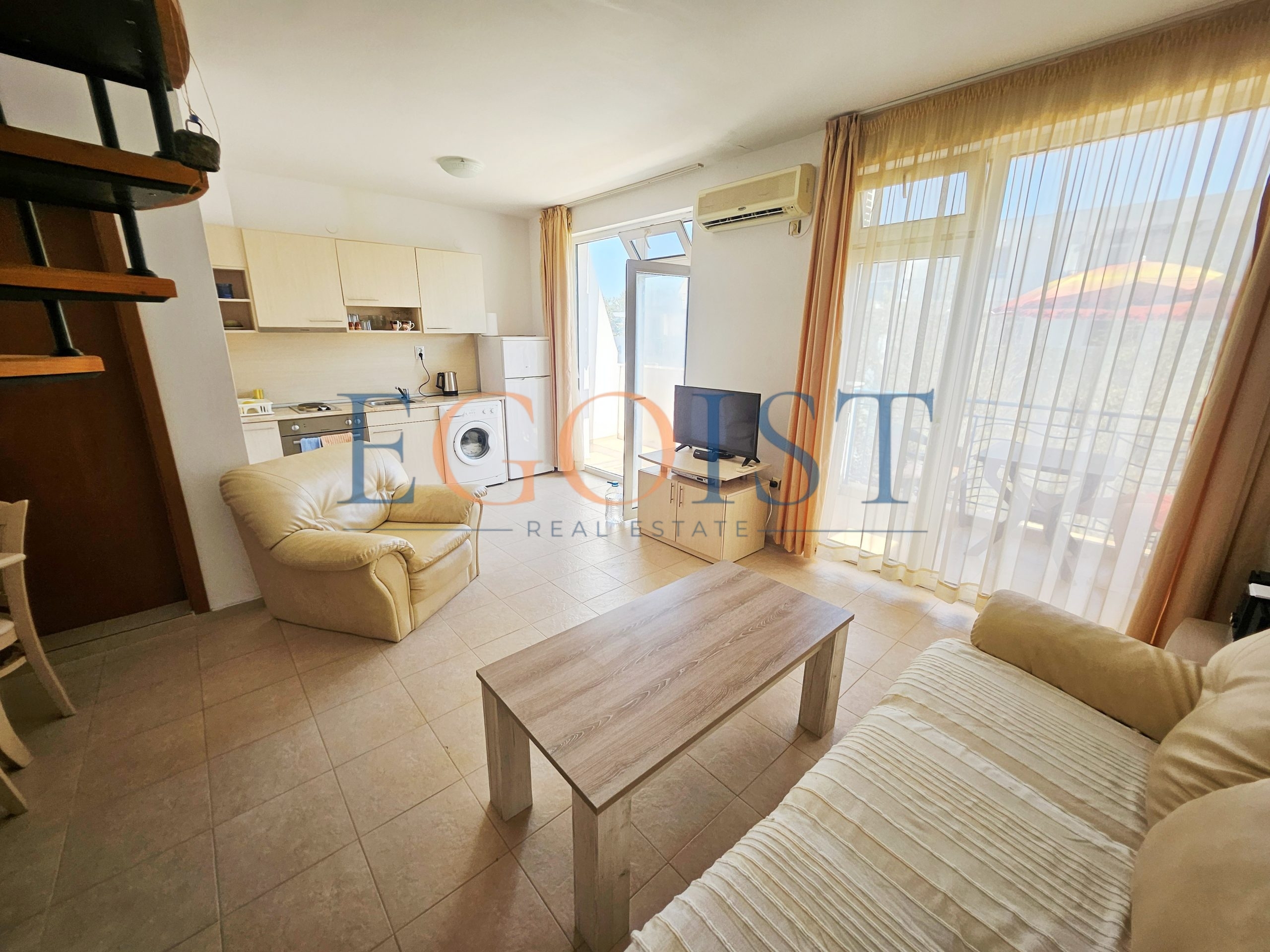 На продажу предлагается апартамент с 2 спальнями, который состоит из прихожей, гостиной с зоной кухни и зоной для отдыха, двух спален, санузла и террасы. Имеется вся необходимая бытовая техника и мебель. Подходит как для круглогодичного проживания, так и для сдачи в аренду.